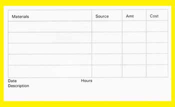 Good beading business practices are not really different from any other business, and keeping track of time and costs is important. Having an easy way to keep track of the time I spent on a project, and on the various aspects of a complex project, has been really useful to me. My first try at this was a little business card size form I created and printed on some yellow business card stock I had left over from another project. The form had space for a short materials list of 5 items, with space for a vendor's code or a brief description, the source, amount used, and cost. Below that materials list was room to show the date, the total hours, and a description of the finished work.